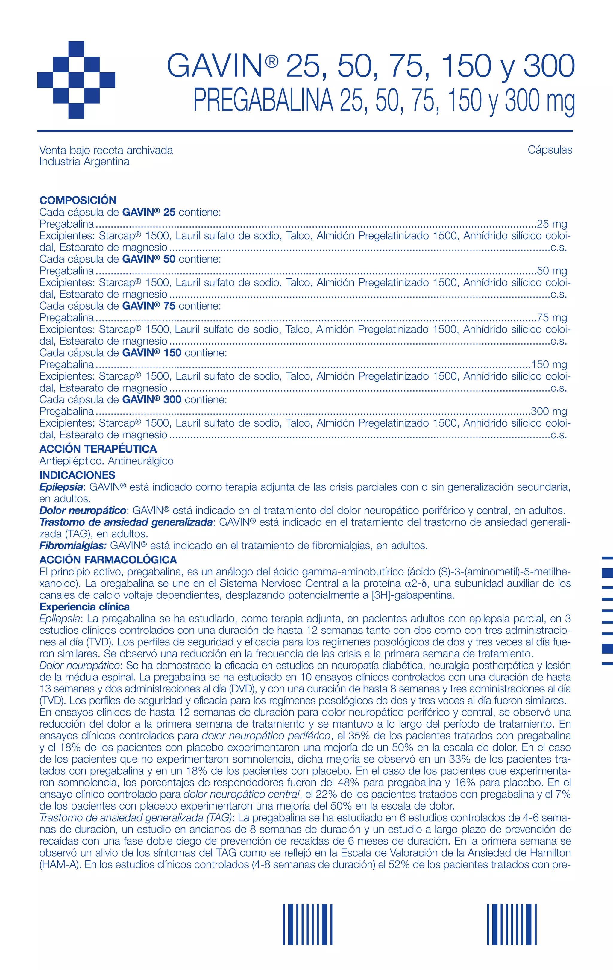 Este documento describe un medicamento llamado GAVIN que contiene pregabalina en diferentes dosis. Proporciona información sobre la composición, indicaciones, acción farmacológica, experiencia clínica, sobredosis, presentaciones, almacenamiento, uso en pediatría y ancianos, reacciones adversas y experiencia post-comercialización del medicamento.