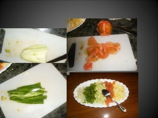 Este documento proporciona instrucciones para hacer gazpacho de dos maneras. La primera involucra trocear verduras como tomates, pepino, pimiento verde y rojo, y cebolla. Estas se maceran con aceite, vinagre y sal por varias horas y luego se trituran y pasan por un colador. La segunda usa las mismas verduras y condimentos pero sin la etapa de maceración. Ambas versiones se almacenan en la nevera y se sirven con guarniciones de tomate, pepino y pimiento pic