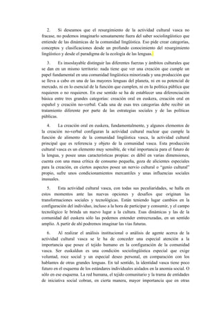 1. El documento discute estrategias para revitalizar la actividad cultural vasca, incluyendo mejorar la colaboración entre agentes sociales, administración pública y mercado; distinguir entre diferentes tipos de creación cultural; y promover un enfoque ecológico que valore la red social y la participación comunitaria.