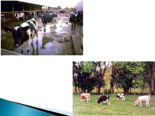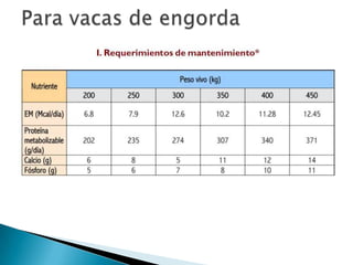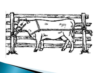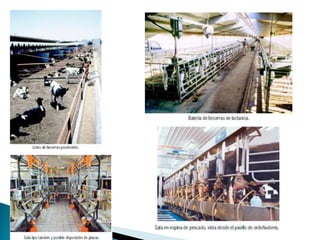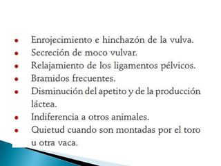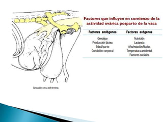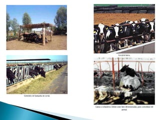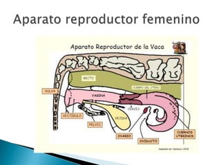 El documento describe la anatomía reproductiva de machos y hembras bovinos, incluyendo órganos como los testículos, útero y ovario. También cubre temas como la reproducción, métodos de monta, inseminación artificial, sujeción de ganado, anestesia y alimentación. Finalmente, discute consideraciones para el diseño de instalaciones ganaderas como corrales y establos.