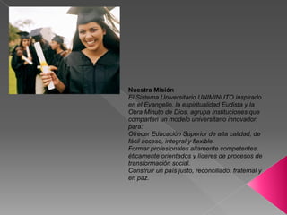 Este documento presenta la misión y visión del Sistema Universitario UNIMINUTO. Su misión es ofrecer educación superior de alta calidad, formar profesionales éticamente orientados y construir un país justo y en paz. Su visión para el 2013 es ser reconocido por las vivencias espirituales, su aporte al desarrollo a través de la educación para el desarrollo, la alta calidad de sus programas y su impacto en la cobertura por el número de sedes. También incluye porcentajes de pérd