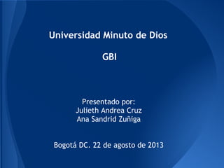 La universidad Minuto de Dios tiene como misión brindar educación de calidad y formar profesionales competentes y comprometidos con la sociedad. Su visión es ser reconocida por su alta calidad académica, por sus obras benéficas, y por su contribución al desarrollo nacional a través de la educación. El documento también presenta instrucciones sobre cómo cambiar la clave en Genesis, visualizar el horario de clases, revisar las notas, e inscribir asignaturas.