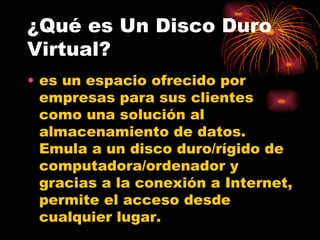 Un disco duro virtual es un espacio de almacenamiento en la nube que permite acceder a los datos desde cualquier lugar a través de Internet. Puede crearse a partir de la memoria RAM de un computador o emular un lector de CD/DVD. Ofrece ventajas como instalar programas sin grabar físicamente y almacenar archivos en la nube de manera accesible desde cualquier lugar.
