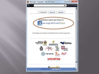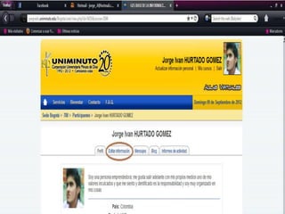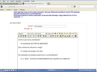 El documento proporciona instrucciones para actualizar la información personal del estudiante en el aula virtual, enviar mensajes a otros estudiantes, y enviar un enlace URL de Prezi como parte de una tarea. Primero, los estudiantes deben hacer clic en "Participantes" para editar su información y guardar los cambios. Luego pueden enviar mensajes a otros estudiantes buscando sus nombres o colocando el nombre en el cuadro de búsqueda. Finalmente, los estudiantes encuentran la opción "Envío dirección URL Prezi" bajo "Sistema