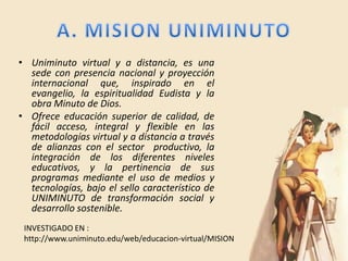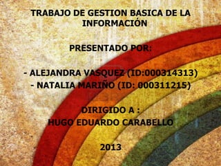 Este documento presenta un trabajo de gestión básica de la información realizado por Alejandra Vásquez y Natalia Mariño para Hugo Eduardo Carabello. El documento incluye la misión y visión de Uniminuto Virtual y a Distancia, así como extractos del reglamento estudiantil que describen los derechos, deberes y modalidades de formación de los estudiantes.