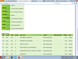 El documento presenta la misión, visión, reglamento estudiantil y procedimientos de la Universidad UNIMINUTO. Su misión es ofrecer educación superior de calidad con acceso flexible para formar profesionales competentes y líderes de cambio social. Su visión es ser reconocida en 2012 por su espiritualidad, contribución al desarrollo a través de la educación y la calidad académica. El reglamento detalla las normas de asistencia y cambio de clave para acceder a Génesis, donde se encuentran los horarios,