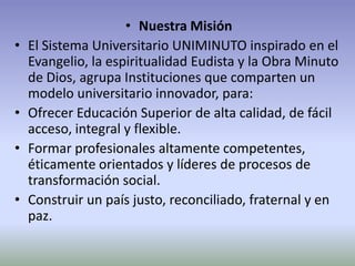 El documento presenta la misión y visión del Sistema Universitario UNIMINUTO. Su misión es ofrecer educación superior de alta calidad, accesible y flexible para formar profesionales competentes y líderes de transformación social con el fin de construir un país justo y en paz. Su visión para el 2012 es ser reconocido por su aporte a la espiritualidad universitaria, la educación para el desarrollo y la cobertura a través de amplias sedes e inscripciones flexibles, además de sus programas académic