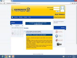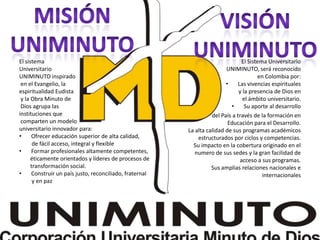 El documento presenta el Sistema Universitario UNIMINUTO, el cual ofrece educación superior de alta calidad, accesible y flexible para formar profesionales competentes y líderes de transformación social. El sistema busca construir un país justo y en paz a través de la educación para el desarrollo. Se destaca la calidad académica, cobertura a través de múltiples sedes, y relaciones nacionales e internacionales del sistema.
