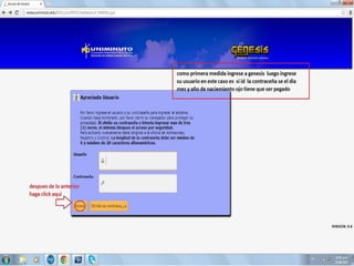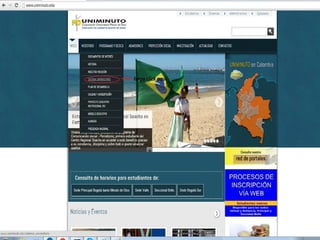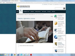 El documento habla sobre los procesos y reglamentos de Uniminuto, incluyendo cómo ingresar a la misión y visión de la universidad, el reglamento estudiantil, los porcentajes que hacen que un estudiante pierda una materia por falta de asistencia, y los procedimientos para ver el horario de clases y notas.