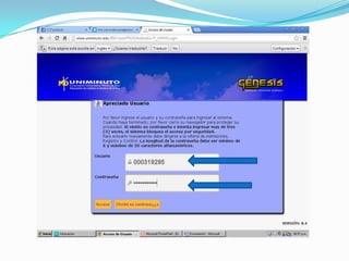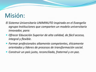 Este documento presenta la misión, visión y principios generales del Sistema Universitario UNIMINUTO. Su misión es ofrecer educación superior de alta calidad, formar profesionales competentes y construir un país justo. Su visión es ser reconocido por sus programas académicos de calidad, cobertura a través de sus sedes, y relaciones nacionales e internacionales. Los principios generales enfatizan su inspiración cristiana, servicio a los pobres, y desarrollo integral de las personas.