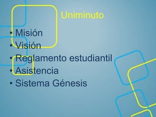 El documento resume los principales aspectos del Sistema Universitario Uniminuto, incluyendo su misión, visión y reglamento estudiantil. También describe el sistema de información Genesis que permite a los estudiantes consultar horarios, notas, inscribir materias y más. El documento concluye con enlaces a las páginas web de Uniminuto y su portal de estudiantes.