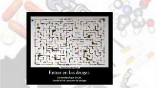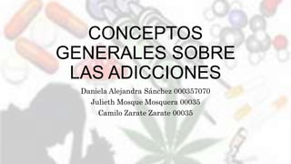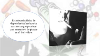 Este documento resume conceptos generales sobre las adicciones. Explica que una adicción es un estado psicofísico de dependencia hacia una sustancia que produce placer, y que puede ser física o psíquica. También describe los síntomas de abstinencia que ocurren cuando se suspende la administración de la sustancia, así como factores de riesgo familiares y psicológicos. Finalmente, menciona algunas de las drogas más comunes como la marihuana, cocaína y heroína.