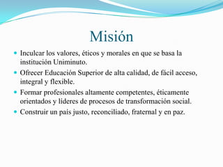 Este documento presenta la misión, visión, reglamentos estudiantiles y procedimientos de la Universidad Minuto de Dios. Su misión es inculcar valores éticos, ofrecer educación de calidad accesible y formar profesionales competentes. Su visión es ser reconocida por su aporte a la educación y desarrollo del país a través de programas académicos de alta calidad.
