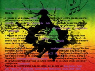 El documento habla sobre el reggae, un género musical originario de Jamaica. Se describe que el reggae se desarrolló a partir de otros ritmos jamaiquinos como el ska y el rocksteady, y que incluye subgéneros como el skinhead reggae, roots reggae y dancehall. También se menciona que aunque el reggae es erróneamente asociado con el movimiento rastafari, este nunca formó parte de la música ceremonial rastafari. Algunos de los intérpretes más conocidos de reggae son Bob Marley, Peter Tosh y Jimmy Cliff