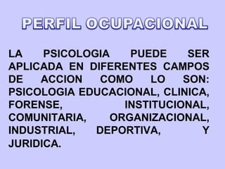 La psicología estudia el comportamiento humano y los procesos mentales. Puede aplicarse en campos como la educación, la clínica, la organización industrial y el derecho. Las competencias más importantes para un psicólogo incluyen la autoconfianza, la flexibilidad, el compromiso y la búsqueda de información.