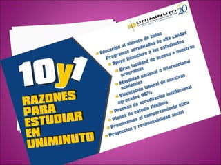 El documento presenta la misión y visión del Sistema Universitario UNIMINUTO. Su misión es ofrecer educación superior de alta calidad, formar profesionales competentes y éticos, y construir un país justo y en paz. Su visión para el 2012 es ser reconocido por sus programas académicos de calidad, su impacto en la cobertura educativa, y sus relaciones nacionales e internacionales.