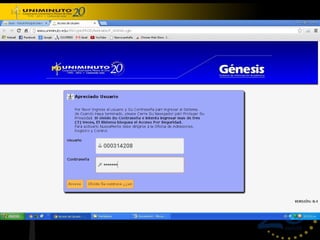 El sistema universitario Uniminuto contribuye al desarrollo del país a través de una educación de alta calidad, manteniendo la espiritualidad en el proceso. El reglamento estudiantil establece normas para todos los estudiantes y especifica que una inasistencia del 15% o más puede llevar a la pérdida de la asignatura, incluso por justificación. También se incluyen procedimientos para el uso de la plataforma Génesis, como cambiar la clave y visualizar horarios y notas.