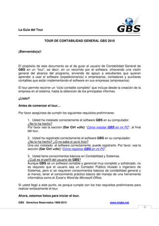 Este documento presenta un tour guiado de cinco pasos para familiarizarse con el software de contabilidad general GBS. El primer paso es crear y seleccionar la empresa modelo "Distribuciones JUMO Ltda." El segundo paso es alimentar los datos iniciales de la empresa como el plan de cuentas, directorio de terceros, tipos de documentos y cuentas bancarias. El tercer paso es digitar los comprobantes contables. El cuarto paso es contabilizar los comprobantes y el quinto paso es obtener informes del sistema. Adicionalmente, se