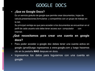 Google Docs es un servicio gratuito de Google que permite crear y compartir documentos, hojas de cálculo, presentaciones y formularios en línea. Para acceder a Google Docs solo se necesita una cuenta de Gmail y acceso a Internet. Google Docs ofrece utilidades como la creación de diferentes tipos de archivos, la importación de archivos desde la PC o la web, y el trabajo en tiempo real sobre archivos compartidos con otros.