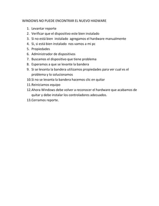 Este documento proporciona instrucciones para resolver el error "Windows no puede encontrar el nuevo hardware" verificando que el dispositivo esté correctamente instalado, agregándolo manualmente si es necesario, identificando el dispositivo problemático en el Administrador de dispositivos para solucionar cualquier problema con sus propiedades o reinstalando los controladores tras quitar y volver a reconocer el hardware.