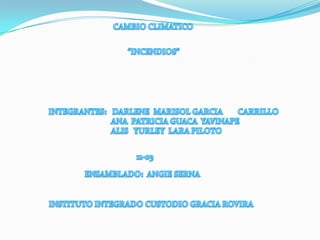 El documento habla sobre el cambio climático y los incendios. Define el cambio climático como la modificación del clima a escala global o regional en parámetros como la temperatura y las precipitaciones. Define un incendio como una ocurrencia de fuego no controlada que puede quemar estructuras y seres vivos. Explica que los incendios se pueden propagar rápidamente y causar heridas graves o la muerte por inhalación de humo o intoxicación.