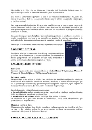 Este documento presenta la guía de estudio para el curso de Computación del Programa de Teología Pastoral de la Dirección de Educación a Distancia. El curso busca enseñar conceptos básicos de informática y computación para desarrollar competencias que permitan acceder, crear e intercambiar información de manera práctica y ética. El curso consta de dos unidades sobre hardware, sistemas operativos y software. El objetivo es mostrar los beneficios tecnológicos y desarrollar habilidades básicas de computación para