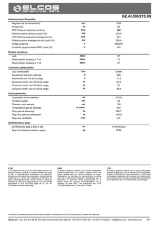 El documento describe las especificaciones técnicas del grupo electrógeno diesel modelo ge.ai.300/275.ss fabricado por Elcos, incluyendo su estructura, sistemas de insonorización, y detalles de funcionamiento. Se detallan las características del motor, alternador, y datos operativos como potencias, consumo de combustible y niveles acústicos. Además, se menciona que los datos y especificaciones están sujetas a modificaciones para mejorar los productos.