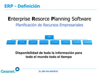 El documento argumenta que el modelo tradicional de ERP ha muerto debido a la disrupción tecnológica y las necesidades cambiantes de las organizaciones. Propone que un enfoque de software basado en la nube que integra múltiples aplicaciones de gestión como CRM, marketing, finanzas y recursos humanos es más flexible y puede satisfacer mejor las necesidades de las organizaciones en el entorno actual.