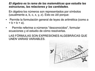 1) El álgebra estudia las estructuras, relaciones y cantidades mediante el uso de símbolos en lugar de números. Esto permite formular leyes de la aritmética de forma general y referirse a números desconocidos.
