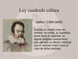 El documento expone la ley cuadrado-cúbica, que establece que al aumentar el tamaño de un objeto, su superficie crece al cuadrado y su volumen al cubo, lo que influye en propiedades físicas como resistencia y peso. Se utilizan ejemplos de distintos seres vivos para ilustrar cómo estos cambios de escala afectan la fuerza relativa y las necesidades alimenticias. Además, se discuten implicaciones de tamaño en la comunicación entre especies y limitaciones de animales pequeños en su interacción con el entorno.