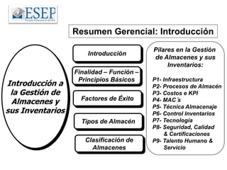 Este documento presenta un programa de especialización en gestión de almacenes y sus inventarios. Explica los nueve pilares clave de la gestión de almacenes, incluyendo la infraestructura, procesos de almacén, costos e indicadores, técnicas de almacenaje, gestión de inventarios, tecnología, seguridad y calidad, y talento humano. También clasifica los diferentes tipos de almacenes y resume los principales conceptos relacionados con la gestión efectiva de almacenes.