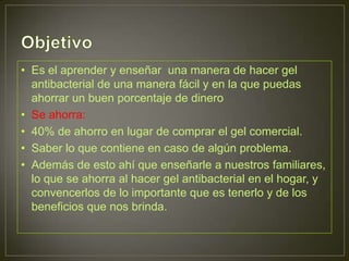 Este documento proporciona instrucciones para hacer gel antibacterial casero de manera fácil y ahorrando dinero. Explica cómo hacer el gel usando alcohol etílico, glicerina, tritetanolamina y carbopol. Además, destaca que el gel casero elimina más del 99% de bacterias y virus y es más barato que comprar gel comercial.