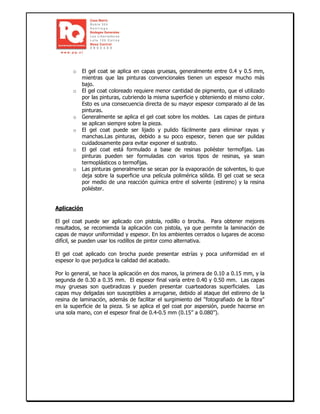 El gel coat es una resina pigmentada que constituye la superficie de las piezas de fibra de vidrio. Proporciona protección contra la intemperie, un acabado coloreado y liso, y sirve como base para pintura. Se aplica en capas gruesas directamente sobre el molde antes de la laminación. El gel coat ofrece ventajas frente a la pintura como mayor espesor, fácil lijado y curado por reacción química en lugar de evaporación de solventes.