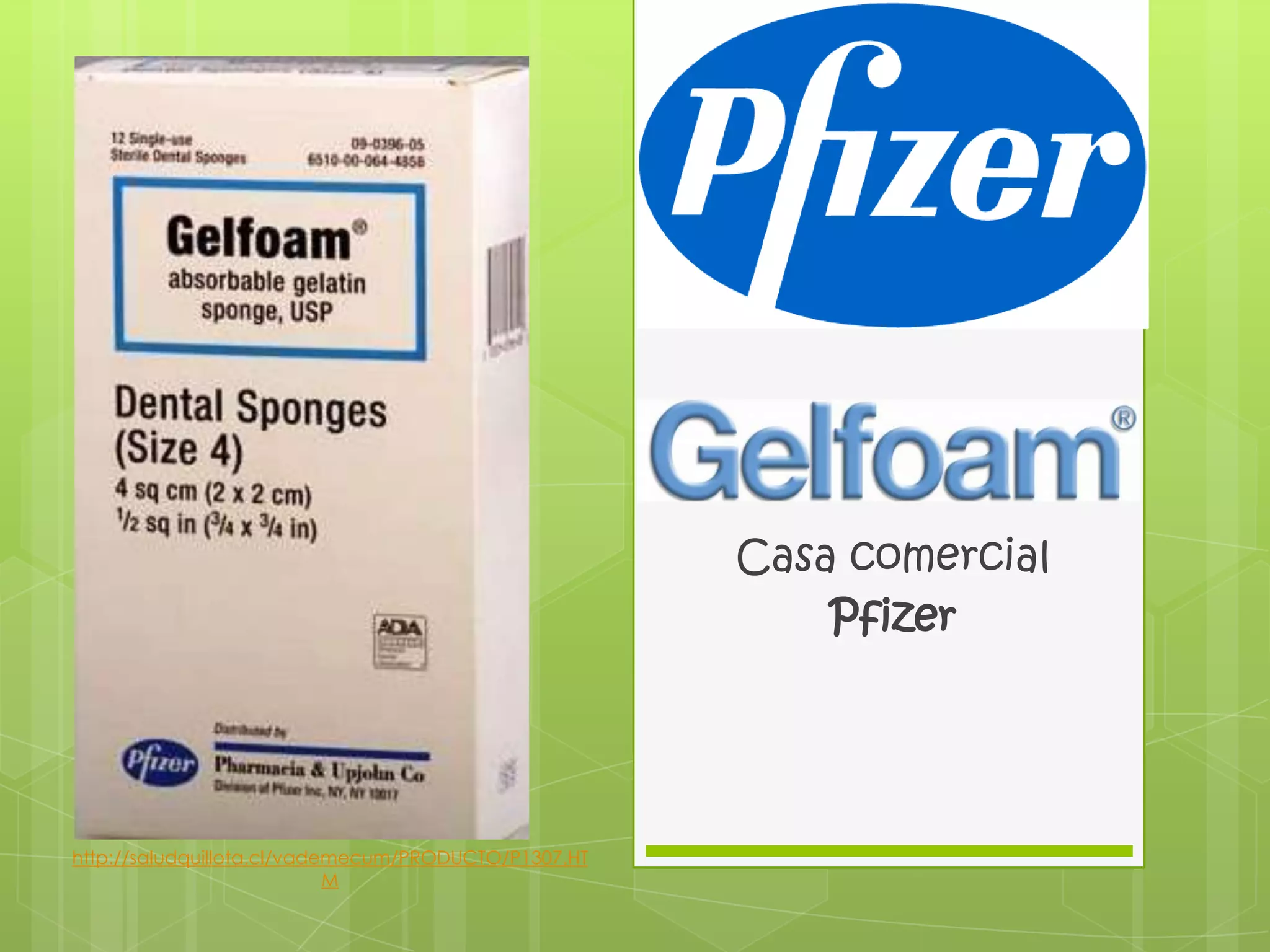 Pfizer es la primera compañía biomédica del mundo con más de 160 años ofreciendo medicamentos para el cuidado de la salud humana y animal. Ofrece soluciones para enfermedades cardiovasculares, infecciosas, del sistema nervioso central, inflamatorias, metabólicas, urológicas, oftalmológicas y de la mujer, con especial atención a la oncología y el VIH. Gelfoam es una esponja de colágeno porcino estéril que se usa en cirugía para controlar sangrado, absorbiendo fluid
