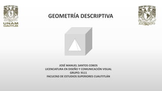 Este documento presenta una serie de temas sobre geometría descriptiva, incluyendo proyecciones cilíndricas oblicuas y ortogonales, proyecciones cónicas, vistas de cubos y hexaedros aplicando conceptos de abstracción geométrica y sistemas de proyección, así como teoría sobre proyecciones en 4 partes con sus respectivos bocetos ilustrativos.