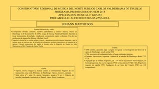 Este documento presenta información biográfica y estilística sobre dos compositores barrocos: Francesco Saverio Geminiani y Johann Mattheson. Geminiani fue un violinista y compositor italiano conocido por sus sonatas y concerti grossi que siguieron el estilo de Corelli. Mattheson fue un compositor, escritor y teórico musical alemán que fusionó estilos italianos, franceses y alemanes e impulsó la inclusión de elementos seculares en la música sacra. Ambos compositores realizaron importantes contribuc