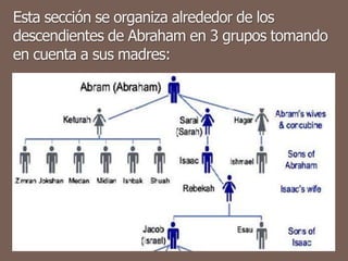 El documento presenta una serie de notas sobre el primer capítulo de 1 Crónicas. Resume las genealogías mencionadas desde Adán hasta Jacob (Israel), siguiendo en gran medida el orden presentado en Génesis. Explica que el cronista se enfoca en el linaje elegido que condujo a David. También menciona brevemente las genealogías de los descendientes de Esaú y los reyes de Edom.
