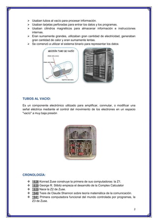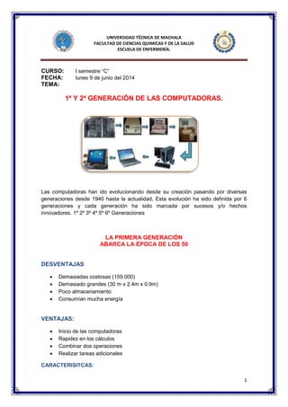 La primera generación de computadoras utilizaba tubos de vacío y tarjetas perforadas, era muy costosa y grande. La segunda generación introdujo los transistores, haciendo las computadoras más pequeñas y eficientes. La tercera generación vio la llegada de los circuitos integrados, reduciendo aún más el tamaño. La cuarta generación trajo los microprocesadores y las computadoras personales. La quinta generación se enfocó en la inteligencia artificial, mientras que la sexta generación podría utilizar superconductores para lograr un mayor rendim