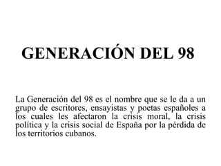 La Generación del 98 y la Generación del 27 fueron grupos de escritores españoles que florecieron a finales del siglo XIX y principios del siglo XX, respectivamente. Ambas generaciones se vieron afectadas por las crisis políticas y sociales de España en sus épocas, y produjeron importantes obras literarias en diversos géneros como poesía, teatro y ensayo. Algunos de los autores más destacados fueron Miguel de Unamuno, Pío Baroja, Ramón María del Valle-Inclán, Federico García Lorca y Raf