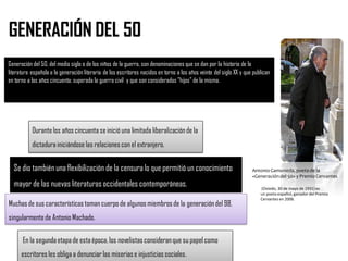 El documento resume la poesía española de los años cincuenta. Las dos corrientes dominantes fueron la neorrealista y la social realista. Ambas se caracterizaron por el compromiso ético del escritor y practicaron el objetivismo literario. La generación del 50 incluyó destacados poetas como Antonio Gamoneda y Ángel González.