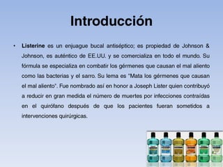 Este documento presenta información sobre Listerine, un enjuague bucal antiséptico propiedad de Johnson & Johnson. Detalla los diferentes tipos de Listerine, incluyendo sus sabores y usos. También describe un concurso artístico propuesto llamado "Bucal-ART" que utilizaría lienzos escupidos con Listerine. La justificación explica que el concurso pretende educar a la gente sobre la importancia de la higiene bucal completa, no solo el cepillado de dientes, y también crear conciencia sobre la falta de acceso a la hig