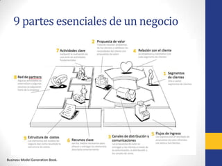 Este documento resume los nueve componentes clave de un modelo de negocio según Alexander Osterwalder. Estos incluyen segmentos de mercado, oferta de valor, canales, relaciones con clientes, flujos de ingresos, recursos clave, actividades clave, asociaciones clave y estructura de costos. El modelo de lienzo muestra la interrelación entre estos componentes y cómo juntos conforman un modelo de negocio exitoso.