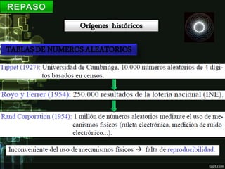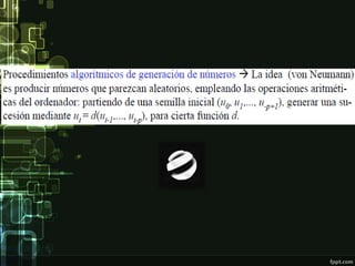 Este documento habla brevemente sobre los orígenes históricos de los números aleatorios y las ecuaciones que los describen. Distingue entre números aleatorios congruenciales y no congruenciales, así como lineales y no lineales. Explica que las ecuaciones recursivas y no recursivas se pueden usar para generar este tipo de números.