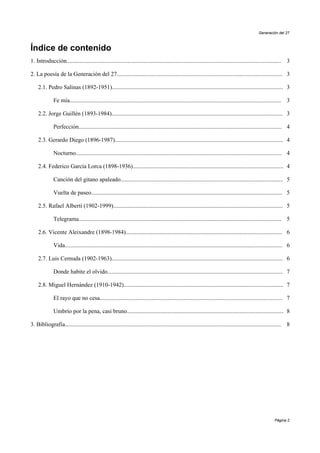 La Generación del 27 fue un grupo de poetas españoles nacidos entre 1892 y 1902 que se dieron a conocer a partir de 1920. Sus principales miembros fueron Pedro Salinas, Jorge Guillén, Gerardo Diego, Federico García Lorca, Rafael Alberti y Vicente Aleixandre. Se caracterizaron por su espíritu vanguardista europeo y por fusionar tradiciones hispánicas y modernismo. Sus obras reflejan temas como el amor, la naturaleza, la vida y la muerte.