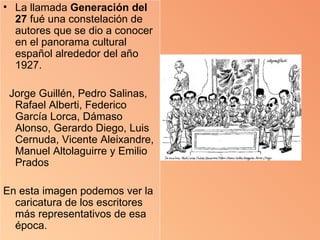 La Generación del 27 fue un grupo de poetas españoles que se dieron a conocer en 1927. Se unieron por un homenaje a Luis de Góngora y estaban influenciados por el surrealismo. Algunos de los poetas más representativos fueron Vicente Aleixandre, Luis Cernuda y Federico García Lorca. Exploraron temas como el amor y la muerte con un lenguaje lírico y versos tanto tradicionales como vanguardistas.
