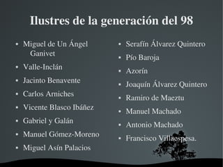 La Generación del 98 fue un grupo de escritores e intelectuales españoles a finales del siglo XIX y principios del XX que buscaban reformar y regenerar España tras la pérdida de sus colonias. Algunos de los autores más importantes fueron Antonio Machado, Miguel de Unamuno, Pío Baroja y Ramón del Valle-Inclán. Compartían temas como la soledad y el paso del tiempo, aunque difirieron del Modernismo en su énfasis en la realidad española y el lenguaje sencillo.