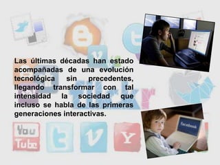 Este documento describe las generaciones interactivas, incluyendo la Generación Y nacida en los 80s y 90s que creció con teléfonos móviles, SMS y entretenimiento portátil, y la Generación Z nacida en los 90s y 2000 que son nativos digitales y se han educado usando Internet. También discute cómo estas generaciones son móviles, multitarea, emancipadas y capaces de hacer grandes comunidades en línea.