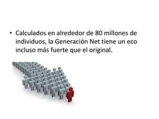 La Generación Net se refiere a los aproximadamente 80 millones de personas que nacieron rodeadas de medios digitales e internet. A diferencia de generaciones anteriores, esta generación está completamente inmersa en la tecnología digital y la usa para casi todo, desde la educación y el trabajo hasta la comunicación y entretenimiento. Si bien esto podría traer grandes cambios a la sociedad, también existe el riesgo de que los jóvenes se aíslen demasiado en el mundo digital y descuiden su desarrollo social. Se prevé que en el futuro pueda haber