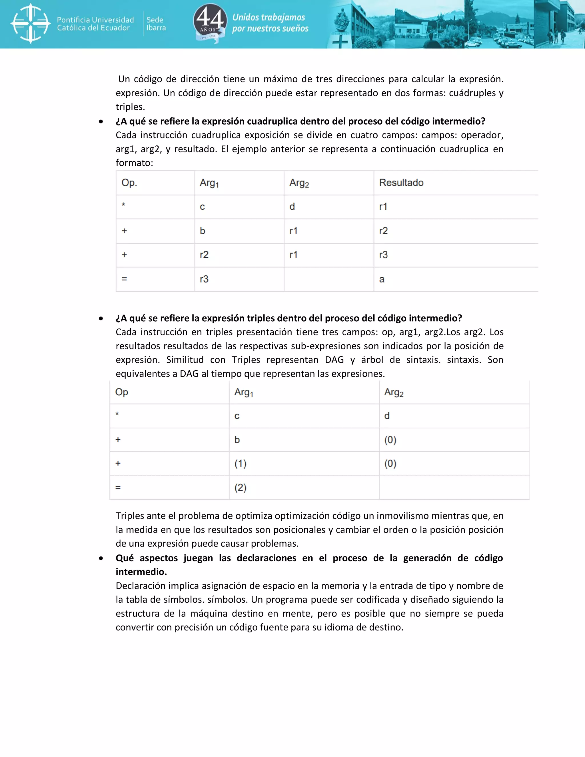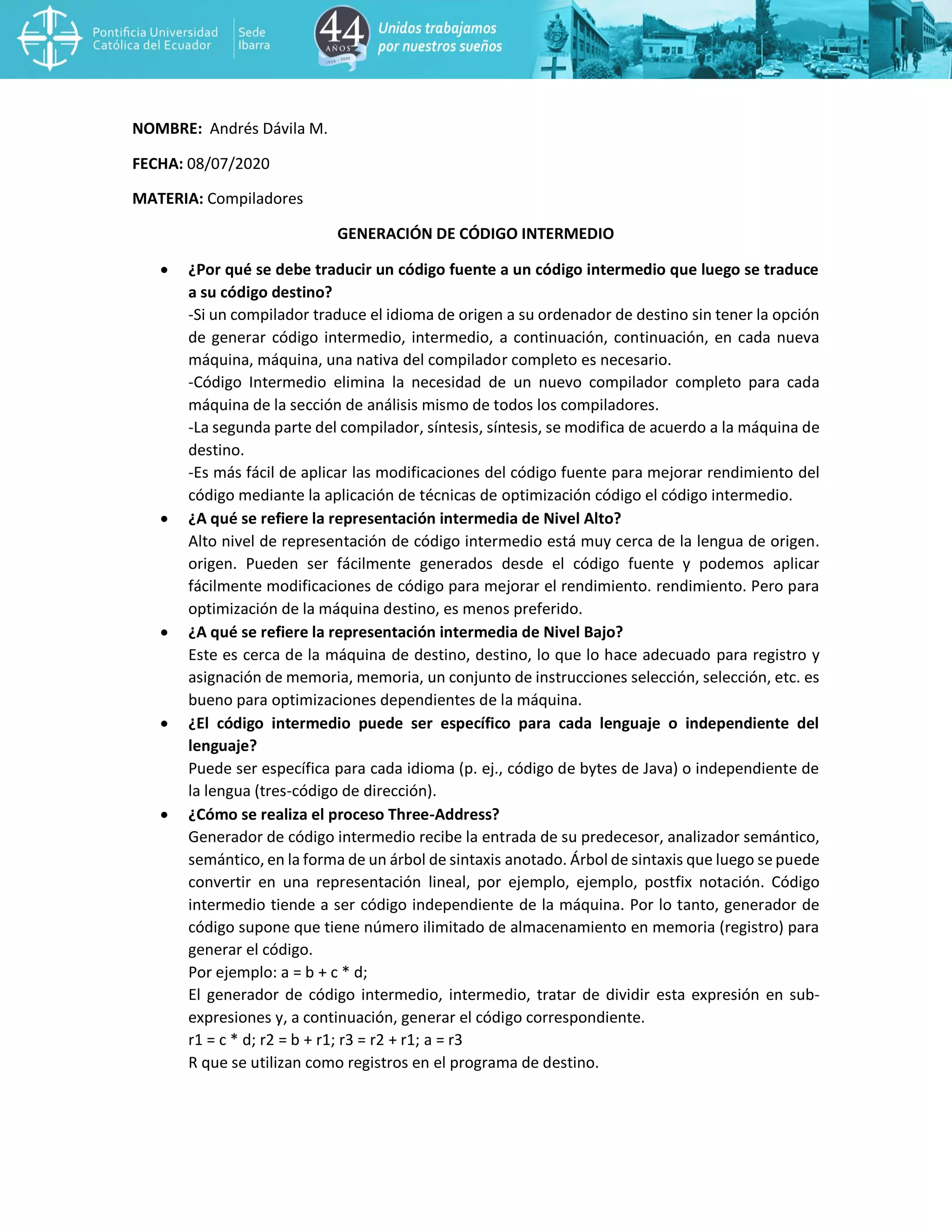 El documento habla sobre la generación de código intermedio en los compiladores. Explica que el código intermedio elimina la necesidad de crear un compilador nuevo para cada máquina, ya que la primera parte (análisis) es la misma para todos, mientras que la segunda parte (síntesis) varía según la máquina destino. También describe los diferentes tipos de representación intermedia como de nivel alto, bajo, independiente del lenguaje o específico; y el proceso three-address que convierte las expresiones en subexpresiones con máximo tres direcciones