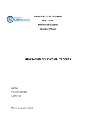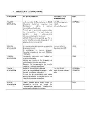 Este documento resume las cinco generaciones de computadoras desde la primera generación en 1947 hasta la quinta generación en la actualidad. Detalla los hitos tecnológicos clave de cada generación como el desarrollo de los circuitos integrados, los microprocesadores y la inteligencia artificial. También menciona a los pioneros tecnológicos más importantes como John Mauchly, John Eckert, John von Neumann y Ted Hoff que contribuyeron al desarrollo de cada generación.